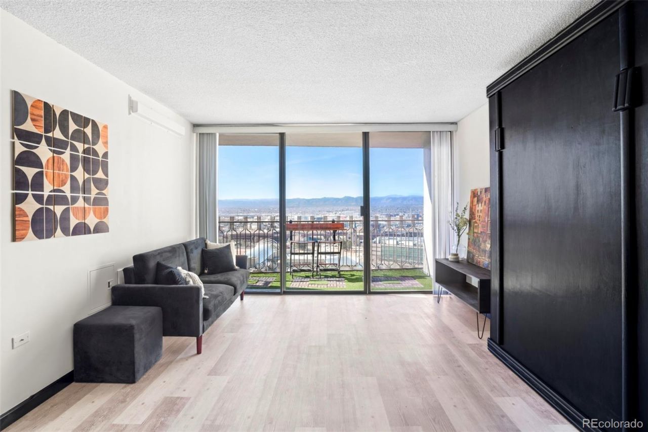 ALL OFFERS WELCOME! MILLION DOLLAR VIEWS! Set within the iconic Brooks Tower, this renovated downtown studio is defined by incredible western panoramic views of the Rocky Mountains. Framed by expansive windows and large sliding glass doors, the open layout captures dramatic sunsets and ever-changing alpine vistas that become a living backdrop to daily life. Luxury vinyl flooring and fresh paint throughout create a clean, modern foundation for this elevated urban retreat.The living area is thoughtfully designed with a built-in Murphy bed, maximizing flexibility while preserving uninterrupted sightlines to the mountains. The kitchen balances style and function with quartz countertops, decorative tile backsplash, and stainless-steel appliances. Sliding doors open to a covered balcony, extending the living space outdoors and offering unobstructed views spanning the Rocky Mountains and the Denver Performing Arts Complex.Offered furnished and truly move-in ready, this residence delivers effortless downtown living. Building amenities include a rooftop pool and patio, fitness center, laundry room, residents lounge, 24-hour front desk, and secured entry. Ideally located just two blocks from Larimer Square and one block from the Ellie Caulkins Opera House, with close proximity to the 16th Street Mall, LoDo, Auraria Campus, Ball Arena, Coors Field, and Denvers vibrant dining, arts, and nightlife?plus convenient access to RTD and light rail.