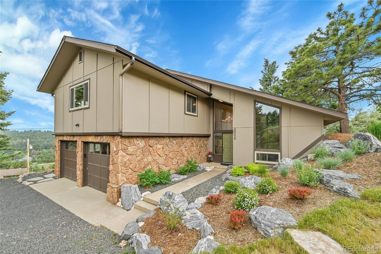 Modern vibes, mountain setting, unbeatable location! Ideally situated in North Evergreen with quick access to trails and amenities, this beautifully updated home blends modern style with convenient mountain living. Thoughtfully renovated throughout over the past few years, the home showcases a refined contemporary aesthetic, including a remodeled kitchen and bathrooms, along with smart upgrades such as WiFi thermostats and a 3-zone heating system. A welcoming entry opens to a vaulted living room with clean lines and newer luxury vinyl flooring that flows seamlessly across the main level. The sleek kitchen with counter seating connects effortlessly to a cozy family room featuring a newer sealed gas fireplace?creating a warm yet modern gathering space. Step outside to take in the views from the custom rock and flagstone patio, complete with a gas fire pit for relaxed outdoor living and entertaining. Extensive landscaping in place too. Upstairs, four bedrooms include an expansive primary suite with a private deck, scenic views, and a beautifully remodeled bath. Public utilities and high-speed internet too! And, this home can be sold fully furnished for a turn-key seamless move in or investment opportunity. Just minutes to Elk Meadow Park and Evergreen Lake, with miles of trails, open space, and nearby amenities including the rec center, art center, shopping and dining?all easily accessible via paved roads. Quick access to Red Rocks, skiing, and metro Denver completes the ideal location. A stylish, move-in ready home with a fresh, contemporary vibe in one of Evergreens most convenient neighborhoods. The best of Evergreen at your doorstep! More photos, 3D walkthrough coming on April 5th.