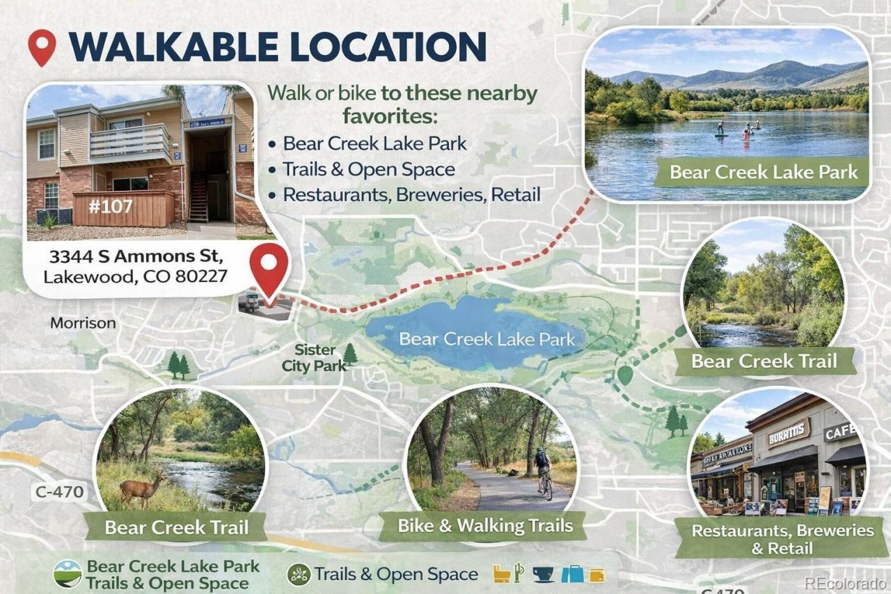 Across from Lakewood Sister City Park ? Snowbird II ? Garden-level end unit ? Wood-burning fireplace ? Enclosed ground-level patio + exterior storage ? In-unit laundry ? Lowest HOA nearby (~$255/mo)Spacious 1 bed/1 bath condo with 850 finished sq ft and a functional great-room layout. Living area features a wood-burning fireplace and a sliding door to the enclosed patio ideal for indoor/outdoor use?with an exterior storage closet. Kitchen opens to the dining area and includes dishwasher, range/oven, refrigerator, trash compactor, plus a dedicated laundry closet. Bedroom offers a walk-in closet, full bath. Central A/C, forced-air heat, ceiling fans, laminate flooring, and double-pane windows. One assigned/deeded parking space (#211) plus guest parking. Community amenities include pool, hot tub/spa, clubhouse, seasonal pond, and tennis courts (per HOA). Trail connections along Bear Creek and proximity to Bear Creek Lake Park. Vacant and available for a quick close. CRA grant program available; buyer must qualify.