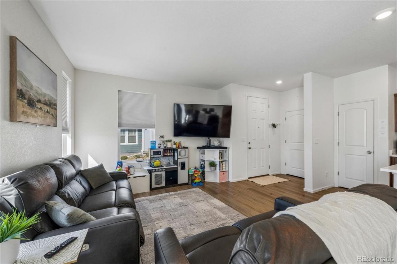 Highly desired floor plan with a BASEMENT!!! This beautifully updated paired home in the popular Sky Ranch community is ready for his new owner! Step inside to find luxury vinyl plank flooring, modern lighting, and a powder room?all designed for comfort and elegance. The open-concept main level features a high-end kitchen with quartz countertops, timeless cabinetry, a spacious pantry, a large island, and stainless steel appliances. The kitchen flows seamlessly into the formal dining area and great room, making it perfect for entertaining. Upstairs, youll find a large located laundry room, two generously sized bedrooms, and a full bathroom. The primary suite is a true retreat, complete with a large walk-in closet and an en-suite bathroom. The unfinished basement offers endless possibilities?it comes with rough-in plumbing and plenty of space to create a second family room, home gym, or even a fourth bedroom! Outside, enjoy a low-maintenance yard with turf grass and stunning mountain views. With a Prime Location, you are conveniently close to Buckley Air Force Base, DIA, top-rated schools, parks, trails, shopping, and dining?everything you need is just minutes away. This turnkey home is ready for you!